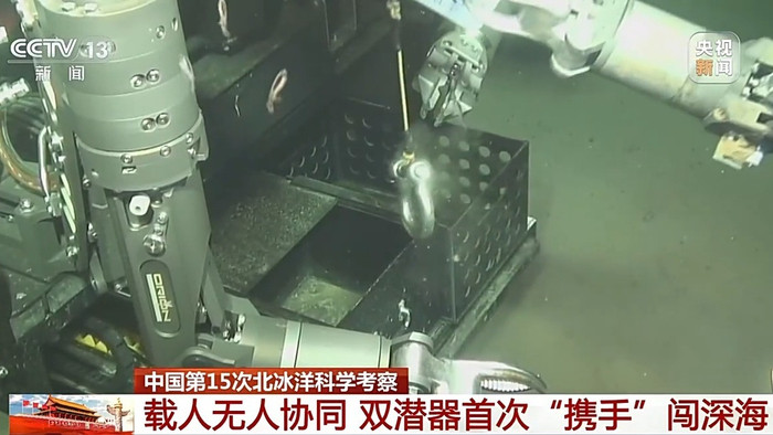“蛟龙”号北极首潜主驾驶傅文韬:因为“蛟龙”号作为载人潜水器,在水下从来都是单点作业,我们这次就拓展了它的作业能力。我们尝试了“蛟龙”号和无人遥控潜水器共同作业,这就要解决包括通信、定位等多方面的问题,然后再考虑下一步联合作业的问题。